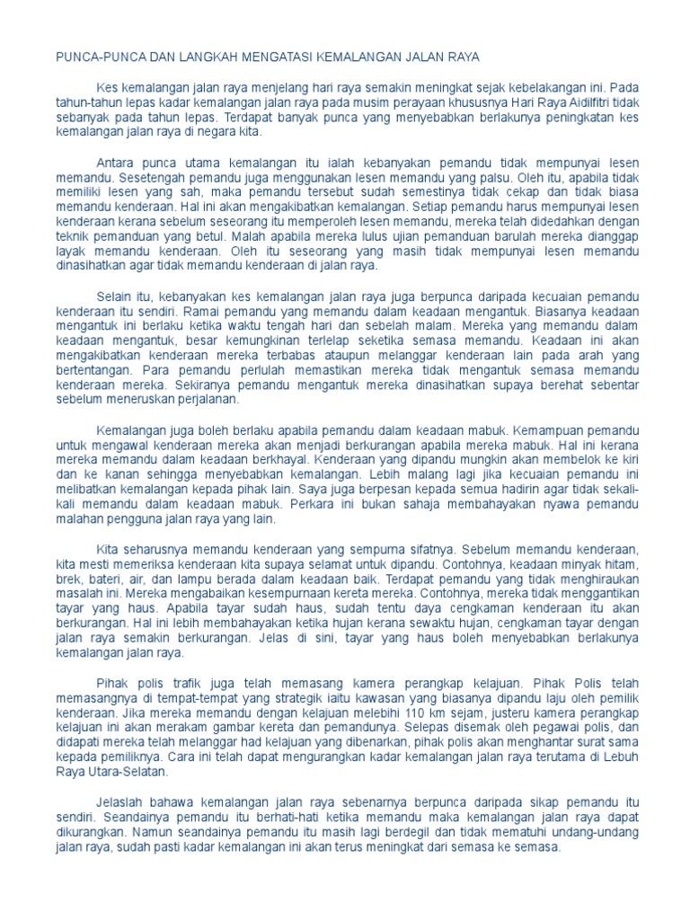 Kemalangan jalan raya tidak harus dipandang enteng, mesti dibanteras ke akar umbi, kudrat semua pihak mesti digembleng, azam janganlah berbelah bagi. Hasil diatas adalah hasil pencarian dari anda karangan fakta mengurangkan kemalangan jalan raya mp3 dan menurut kami yang paling cocok adalah karangan fakta play download. Berikut disertakan contoh karangan bahasa melayu pt3 yang bertajuk kemalangan jalan raya. Pada pendapat saya, kerajaan memainkan peranan penting dalam usaha penyelesaian ini. Kemalangan jalan raya yang berlaku telah menyebabkan kecederaan, kematian serta kerosakan kenderaan yang terbabit.