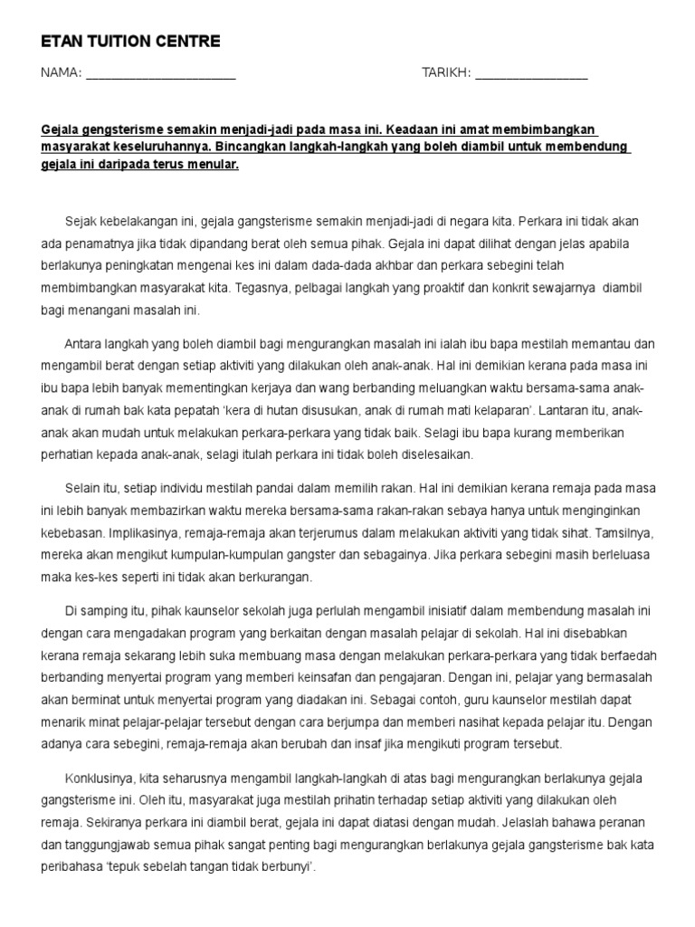 Kemalangan jalan raya tidak harus dipandang enteng, mesti dibanteras ke akar umbi, kudrat semua pihak mesti digembleng, azam janganlah berbelah bagi. Contoh karangan bahasa melayu pt3. Tugasan karangan pelancongan pt3 : Usaha memajukan sektor pelancongan di malaysia. Di samping itu, kerajaan juga mestilah mengadakan kempen mengurangkan kemalangan jalan raya.