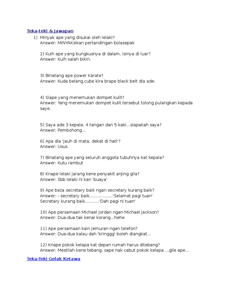 Teka teki lawak , kelakar, lucu, cerita humor, ketawa.com, pantun teka teki teka teki lawak : Jika kita tertawa lepas, hati menjadi senang, kita. Kemudian kongsikan markah anda di bahagian komen, dan. Teka teki humor dan jawabannya. 1) lubang ape yang rasanye hangat, nikmat dan nyaman?