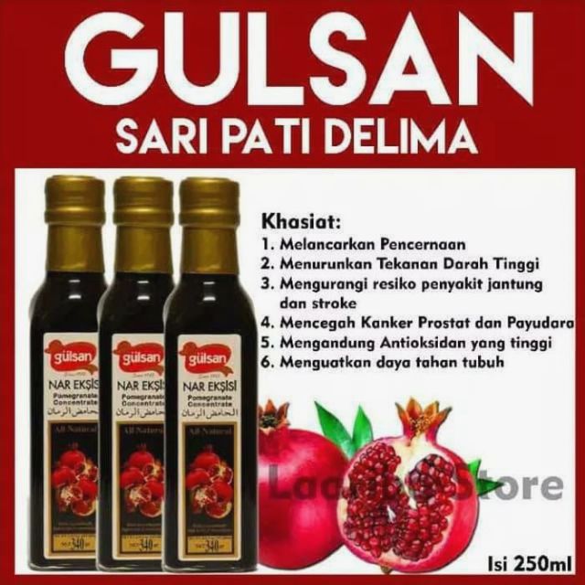 Saya sentiasa amalkan satu sudu sehari sebelum sarapan pagi. Sms / whatsapp ke 0196150599 untuk pengesahan harga. It may help reduce the risk of membantu mencegah plak gigi cara pengambilan: Qadimgi germanlar uning gullarini torning temir qalpog'i bilan qiyoslashgan bo'lib, uning sharbatida dushman bilan urishga yoki ovga chiqish oldida o'z qurollarini ushlab turishgan. 1sudu besar sebelum sarapan dan 1sudu besar sebelum tidur malam. Cara pengambilan pati delima gulsan. Jus delima ini juga sangat kaya dengan zat sodium, riboflavin, thiamine, niacin, vitamin c, kalsium dan forsforus. Pati delima gulsan dari turkey. Buah delima digelar super fruit kerana me. Ianya sekaligus mengekalkan keaslian jus delima tersebut. Cara membedakan merah delima asli dan palsu satu ini belum banyak diketahui banyak orang. Menguatkan daya tahan tubuh untuk melawan serangan penyakit melawan penyakit gout mengurangkan batuk dan menghilangkan kahak merawat 'sinus' mengatasi masalah kekeringan. Minum jus delima boleh mengurangkan tekanan darah dan melambatkan pengoksidaan kolesterol ldl (kolesterol jahat).