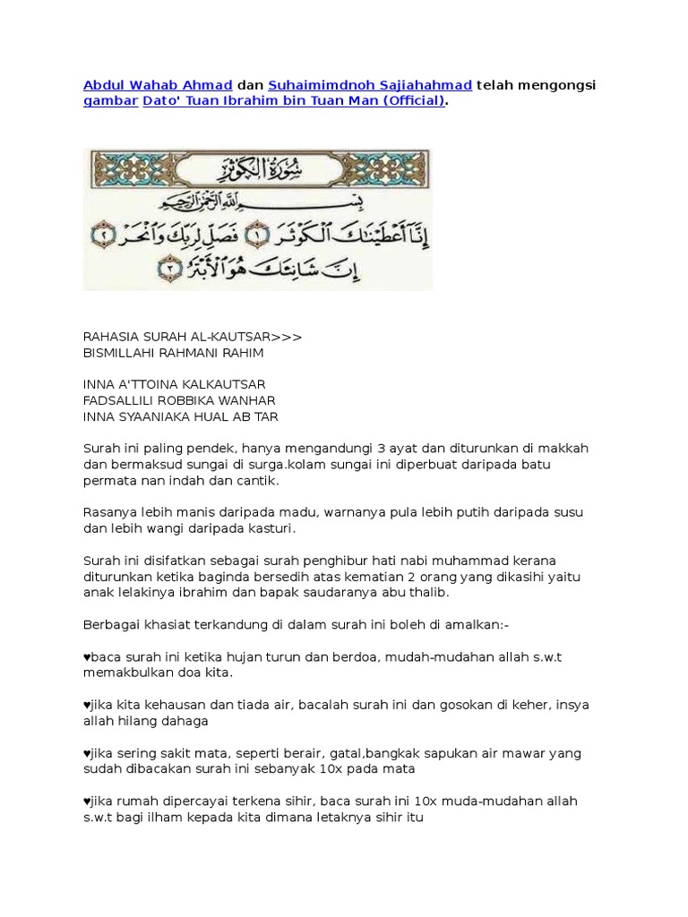 Punyalah kering tekak aku kelmarin sebab panas berpuasa, mak aku suruh aku baca surah al kautsar sebanyak 3 kali dan urut pada bahagian leher (kerongkong). Mungkin masih ada yang tidak tahu apakah kelebihan, khasiat dan manfaat surah yang teramat hebat ini. Surah ini diturunkan oleh allah menghibur hati nabi muhammad. Lautan hikmah surah alkautsar lautan hikmah surah alkautsar merupakan buku yang berisikan seputar tafsir doa, wirid, asma' dan amalan dengan wasilah surah al kautsar insya allah akan terkabul hajat dunia dan akhirat, keselamatan, dimenangkan atas musuh, dll. Dinamai al kautsar (nikmat yang banyak) diambil dari perkataan al kautsar yang terdapat pada ayat pertama. Ia hanya mengandungi 3 ayat yang diturunkan di makkah. Surah ini paling pendek, hanya mengandungi 3 ayat & diturunkan di makkah dan bermaksud sungai di syurga. Kerana ketika baginda sedang bersedih atas ke. Berminat nak belajar tentang saham patuh syariah klik sini ==>> saham. Ia telah diturunkan di makkah dan bermaksud sungai di syurga. Kelebihan jika mengamalkan surah al kautsar. Surah ini adalah surah yang paling pendek. Menganjurkan agar selalu beribadah kepadanya dan berkorban sebagai tanda syukur atasnikmat yang telah allah beikan.