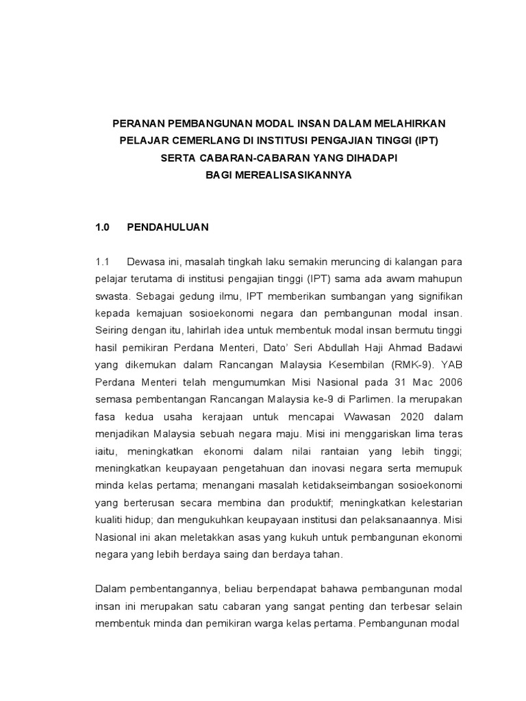 Cabaran Modal Insan from imgv2-2-f.scribdassets.com Tanpa sumber manusia berkualiti, sesebuah negara akan lemah kerana ketiadaan Modal insan yang lemah tidak mampu menyumbang secara efektif kepada organisasi. Melihat kepada isu dan cabaran dewasa ini sudah pasti modal insan yang berpendidikan dan berkemahiran sahaja tidak memadai. Cabaran pembangunan modal insan di era globalisasi kurang jatidiri dan semangat kenegaraan. A) amalan rasuah yang masih menjadi amalan dalam sesetengah organisasi yang akan melemahkan sistem pengurusan. Pada permulaan pembangunan modal insan, fokus terhadap pertumbuhan dan pembangunan ekonomi malaysia ditumpukan kepada sektor pembuatan. Keadaan ekonomi semasa telah mendesak para pemimpin perniagaan untuk memastikan diri mereka sealiran dengan trend semasa. Sorotan literatur menunjukkan kajian empirikal mengenai program pmi di institusi ini masih kurang dijalankan.