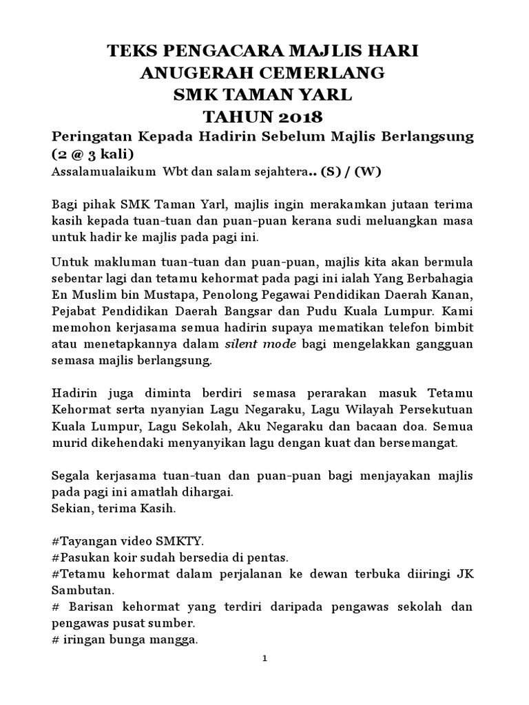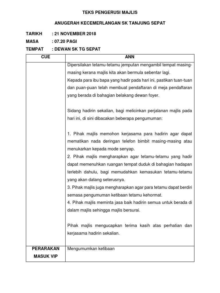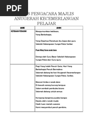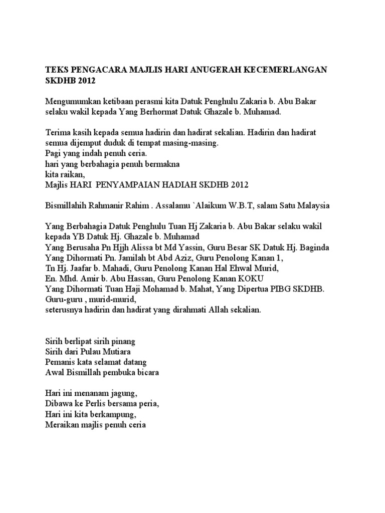 Majlis hari anugerah kecemerlangan dan graduasi prasekolah, sk kota setia tahun 2013. Majlis mengucapkan ribuan terima kasih di atas pembacaan doa itu tadi. Majlis pelancaran nilam 2018full description. Skrip pengacaraan hari anugerah kecemerlangan sk kati. Teks pengacara majlis anugerah kecemerlangan smk kampong jawa. Apabila diumumkan ketibaan para tetamu jemputan. Sila download menggunakan link yang telah disediakan. Untuk menyampaikan laporang bertugas pada minggu lepas. Majlis anugerah kecemerlangan teknopen09.doc teks majlis persaraan guru besar en muhagirin.doc teks mc hari anugerah akademik terbilang 2011 sjkc sin hua.doc Majlis anugerah kecemerlang ini diadakan untuk memberikan pengiktirafan kepada semua pelajar yang telah berjaya mencapai prestasi akademik yang. Semoga majlis ini menjadi titik permulaan buat semua exco khususnya dalam menjalankan tugas dengan lebih amanah. Hari ini, di sini dibacakan beberapa pengumuman: Sesungguhnya majlis pada hari ini merupakan perlantikan secara rasmi exco 2018 menjalankan tugas yang dipertanggungjawabkan.